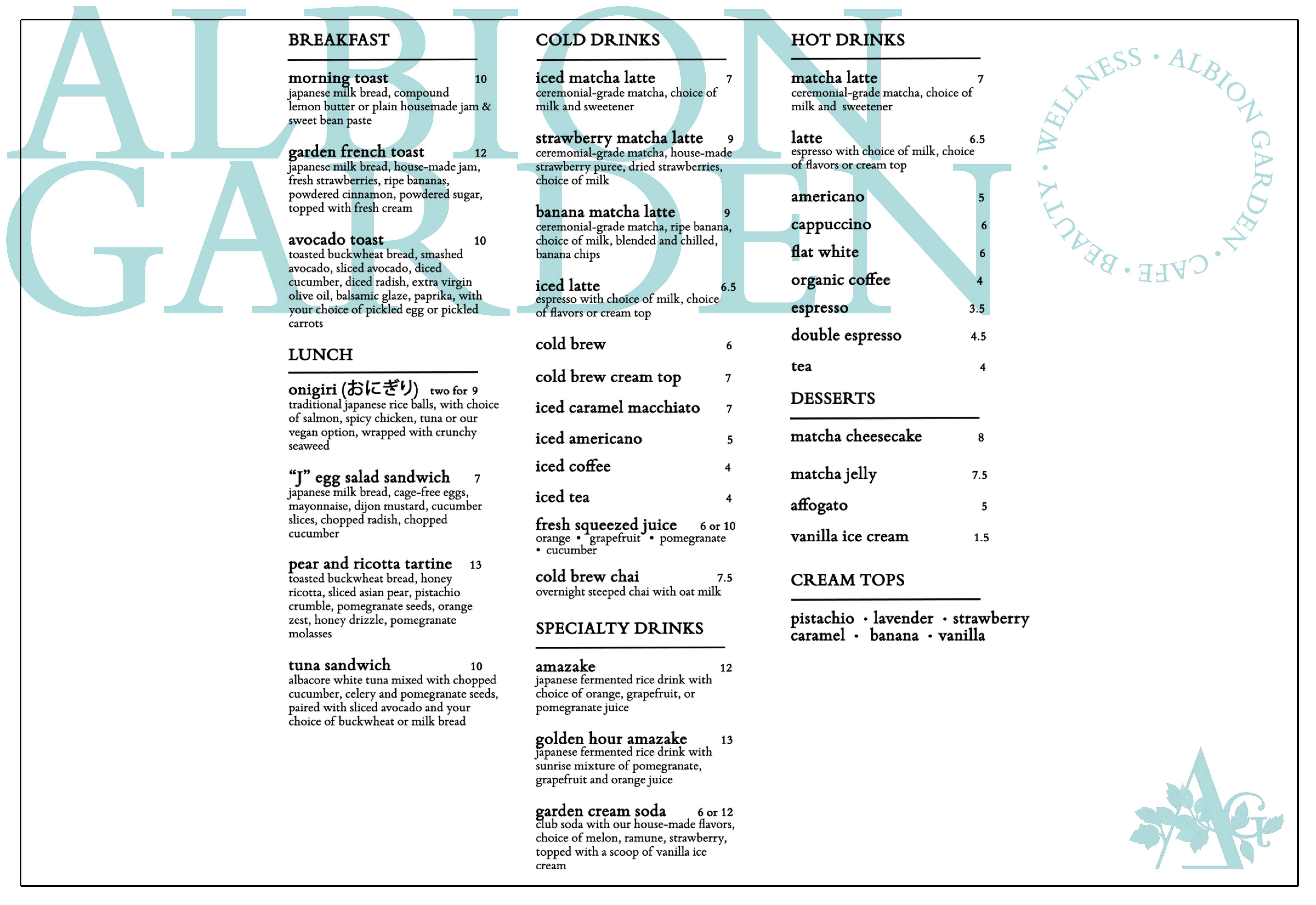 Our cafe is curated to include some Japanese and SoCal favorites, like our savory Sprinkle sushi and smooth Uji Matcha Latte. Dine - in our outdoor seating on the patio, or pickup and delivery is available.